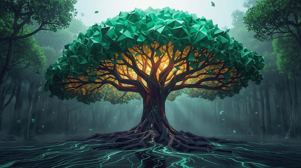 Ein Low-Poly Meisterwerk geometrischer Natur. Ein Baum des Lebens wächst aus Datenströmen, seine Krone aus smaragdgrünen, bernsteinfarbenen und violetten Polygonen schimmert im digitalen Nebel. Inspiriert von der Geburt von Colette – eine Pionierin, die Worte mit Sinnlichkeit belebte. Für Räume, die Brücken schlagen zwischen organischem Wachstum und digitaler Ästhetik.