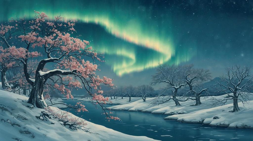 Ein surreales Meisterwerk, das Unmögliches möglich macht. Smaragdgrüne Nordlichter tanzen über einer verschneiten Winterlandschaft, während ein Kirschbaum in voller Blüte den Schnee mit Rosa durchbricht. Die Kollision von Arktis und Frühling, von Eis und Lebenslust. Ein Bild über die Magie des Übergangs – für Räume, die Wunder erwarten und Grenzen überschreiten.