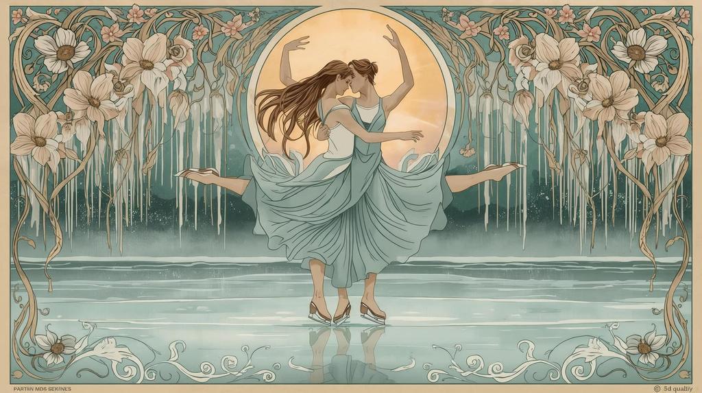 Feiern Sie die Liebe und die Eleganz am 14. Februar 2026 mit diesem einzigartigen Kunstwerk im Jugendstil. Es fängt die fließende Bewegung des Eiskunstlaufs ein und verwandelt sie in ein zeitloses Dekor aus Gold, Frost und Leidenschaft. Die harmonischen Kurven und floralen Eis-Elemente spiegeln die Verbundenheit zweier Seelen wider, die auf dem glatten Parkett des Winters ihren gemeinsamen Rhythmus finden. Ein dekoratives Highlight für jedes Zuhause, das Ästhetik und Gefühl vereint.