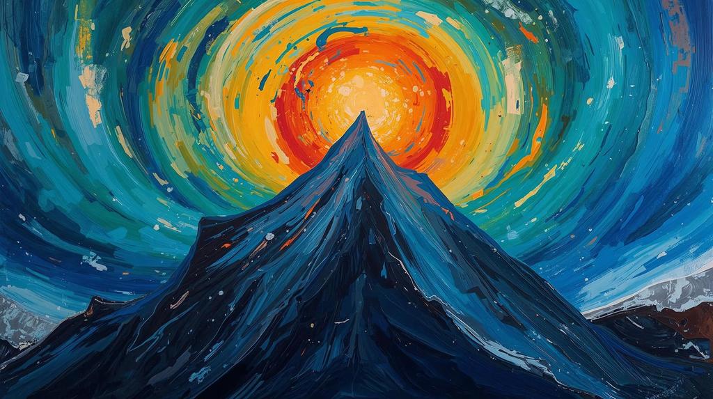 Dieses Werk ist eine hochemotionale Interpretation des 17. Februar 2026. Im kraftvollen Stil des Expressionismus wird die Kälte des Winters durch die spirituelle Hitze eines Gipfelfeuers herausgefordert. Tiefes Indigo trifft auf explosives Orange – eine Farbwahl, die typisch für die „Blauer Reiter“-Bewegung ist und die tiefe Verbundenheit zwischen Mensch, Natur und kosmischer Energie symbolisiert. Ein ideales Sammlerstück für Räume, die nach Energie, Tiefe und einer starken künstlerischen Aussage verlangen.