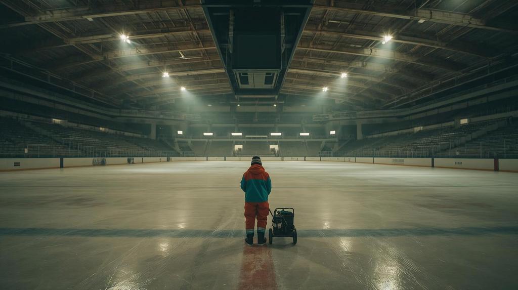 Erleben Sie die Stille nach dem Sturm am 25. Februar 2026. Dieses Kunstwerk im Lofi-Stil fängt die introspektive Ruhe eines leeren Eisstadions ein. Ein einsamer Arbeiter, klein gegenüber der monumentalen Architektur, bereitet sich auf die nächste Stille vor. Mit seiner warmen, nostalgischen Farbpalette und dem spürbaren Filmkorn ist es eine Hommage an die ungesungenen Momente der Vorbereitung und des Abschieds. Perfekt für Räume, die nach Gelassenheit und urbaner Melancholie verlangen.