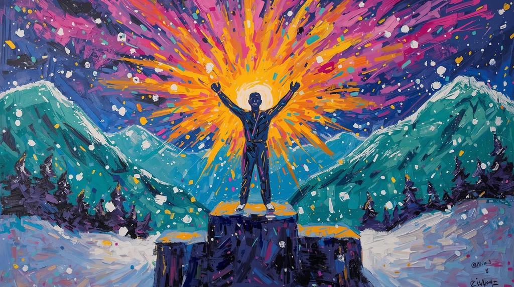 Erleben Sie den 21. Februar 2026 als eine Explosion der Sinne. Dieses Werk im Stil des Fauvismus bricht mit allen farblichen Konventionen, um die emotionale Hitze des Sieges inmitten der alpinen Kälte darzustellen. Wo andere nur weißen Schnee sehen, zeigt dieses Bild ein Meer aus Violett und Gold. Ein kraftvolles Statement für Mut, Lebensfreude und den Triumph des menschlichen Geistes. Ein Muss für Räume, die nach Energie und einem mutigen Farbakzent verlangen.