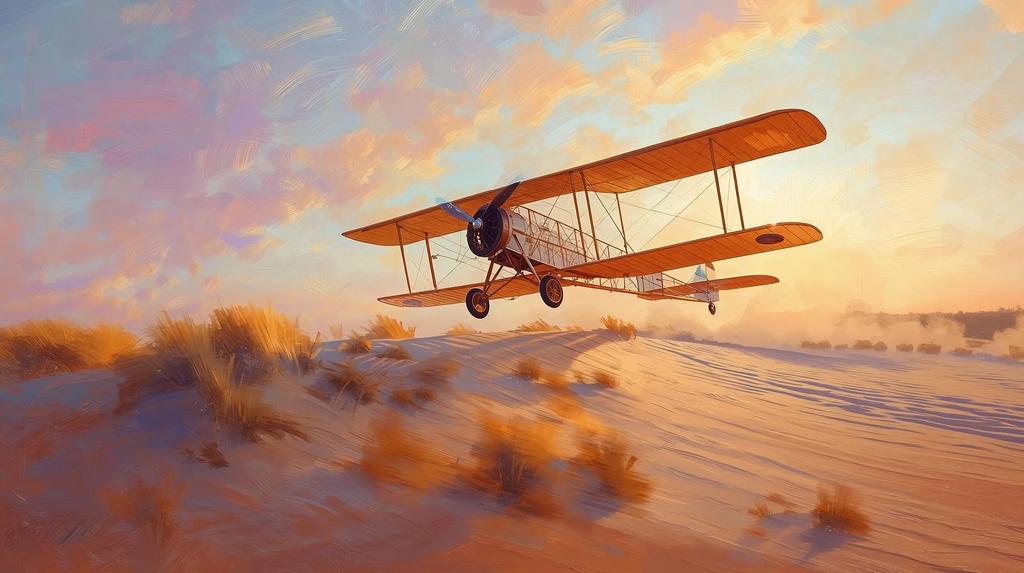 Ein impressionistisches Meisterwerk flüchtiger Bewegung. Lose Pinselstriche fangen das erste Flugzeug ein, wie es über goldene Dünen ins Licht steigt – Propeller als farbige Wirbel, der Himmel in zartem Rosa und Lavendel. Inspiriert von der Patentierung der Wright-Brüder: ein Bild über den Mut, die Schwerkraft zu vergessen. Für Räume, die Träume fliegen lassen.