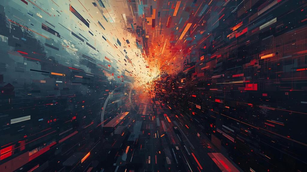 Ein explosives Meisterwerk digitaler Transformation. Geometrische Fragmente schießen aus einem Kern aus reinem Licht, wo Orangerot auf Tiefseeblau trifft und Struktur im Chaos entsteht. Inspiriert von der Entdeckung der Quantenmechanik durch Max Planck dem Moment, als klassische Physik zerfiel und neue Realität geboren wurde. Ein Bild für Räume, die Energie und radikalen Wandel atmen.
