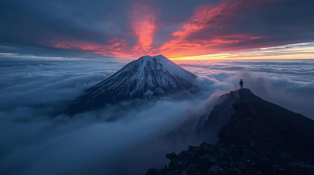 Ein romantisches Meisterwerk heroischer Naturgewalt. Der Kilimandscharo bricht durch ein Wolkenmeer, lavarote Strahlen tauchen die Ewigkeit in Feuer. Ein winziger Mensch am Abgrund – Triumph und Demut in einem Blick. Inspiriert von Hans Meyers Erstbesteigung – ein Bild über die Stille, die man nur auf dem Gipfel findet. Für Räume, die Ehrfurcht und die Größe der Natur suchen.