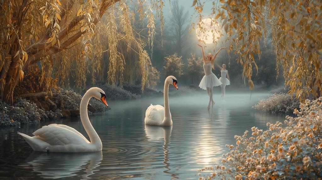 Ein symbolistisches Meisterwerk zwischen Wachen und Schlaf. Schwäne erheben sich aus silbernem Nebel, Balletttänzerinnen schweben als Geister zwischen perlmuttartigen Weiden – metallisches Gold und Silber verschmelzen zu einer Traumlogik aus Tanz und Mondlicht. Inspiriert von der Uraufführung des Schwanensees – ein Bild über die Verwandlung und die Sprache des Körpers. Für Räume, die Poesie atmen und Grenzen auflösen.