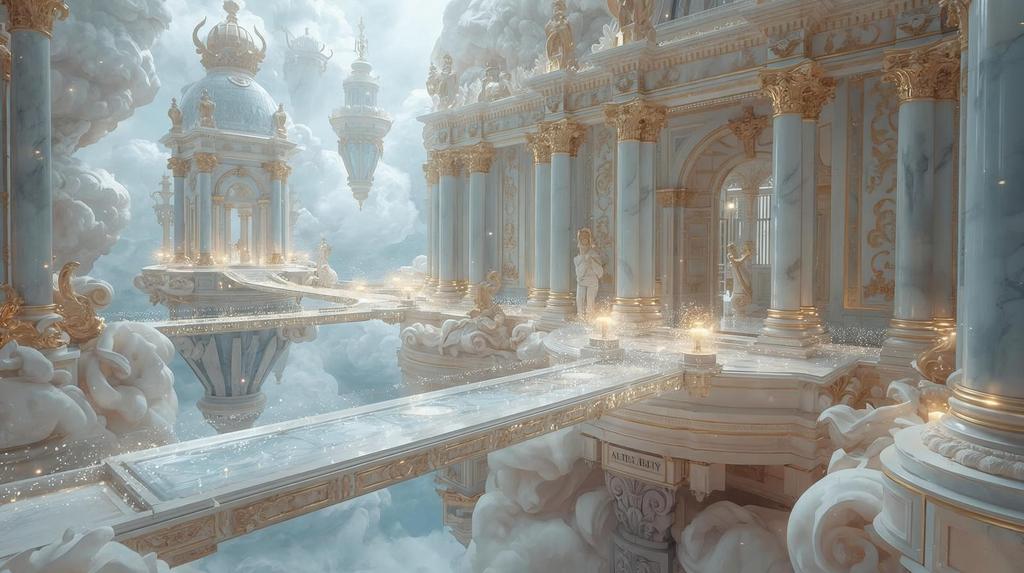 Ein rococohaftes Meisterwerk digitaler Eleganz. Schwimmende Marmorinseln schweben in pastellfarbenen Wolken, verbunden durch pulsierende Brücken aus Licht. Tausende Glühwürmchenlichter tanzen zwischen vergoldeten Säulen – eine Kathedrale der Verbindung, geboren aus der Idee, dass alle Menschen eins sein können. Für Räume, die Leichtigkeit, Opulenz und die Poesie des Netzes feiern.