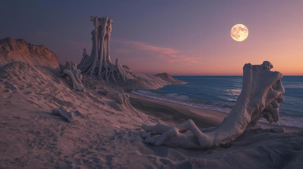 Ein surreales Meisterwerk prähistorischer Träume. Versteinerte Riesenknochen ragen aus fließendem Sand wie Kathedralen einer vergessenen Welt, während zwei Monde über dem violett-orangen Horizont wachen. Mary Annings Entdeckung wird zum Traum – die Vergangenheit atmet, die Wüste flüstert. Ein Bild für Räume, die das Unmögliche möglich machen und die Grenzen von Zeit und Raum aufheben.