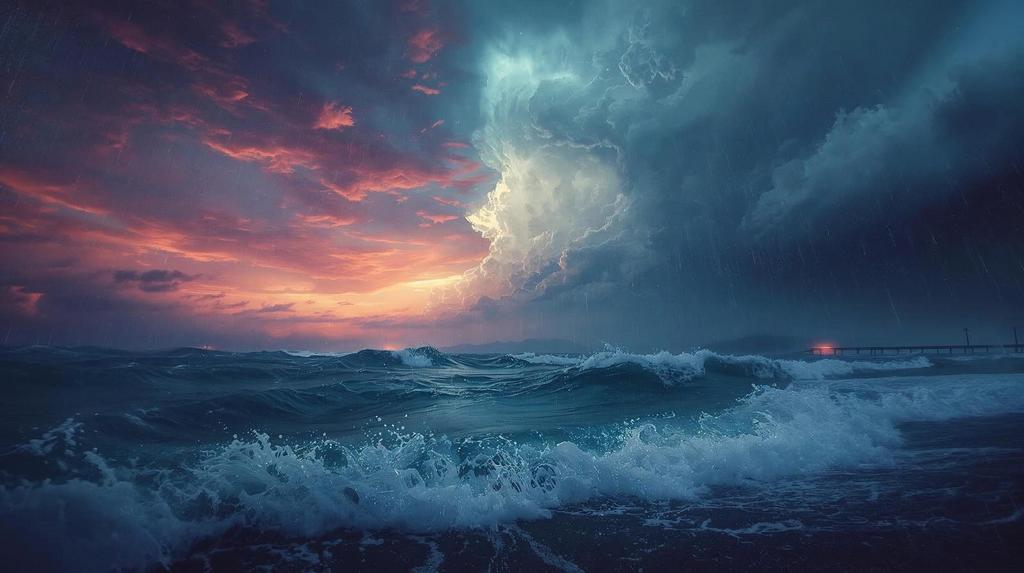 Ein kraftvolles Meisterwerk ozeanischer Dramatik. Tosende Wellen brechen sich gegen den Himmel, während ein gewaltiger Wolkenbruch aus stürmischem Grau in flammendes Orange übergeht. Am Horizont kämpft das letzte Licht gegen die Dunkelheit, ein ferner Steg als winziger Zeuge der Naturgewalt. Ein Bild für Räume, die Kraft und Leidenschaft atmen.